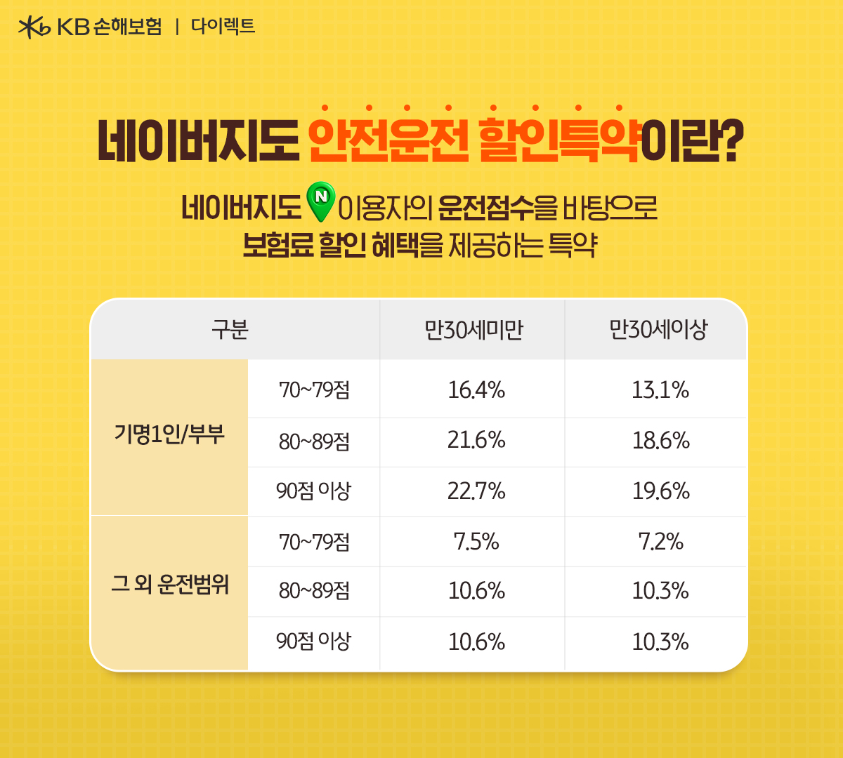- 운전자의 연령과 최근 6개월간 네이버지도 주행거리(500km 이상), 그리고 안전운전 점수에 따라 개별적으로 할인율 적용