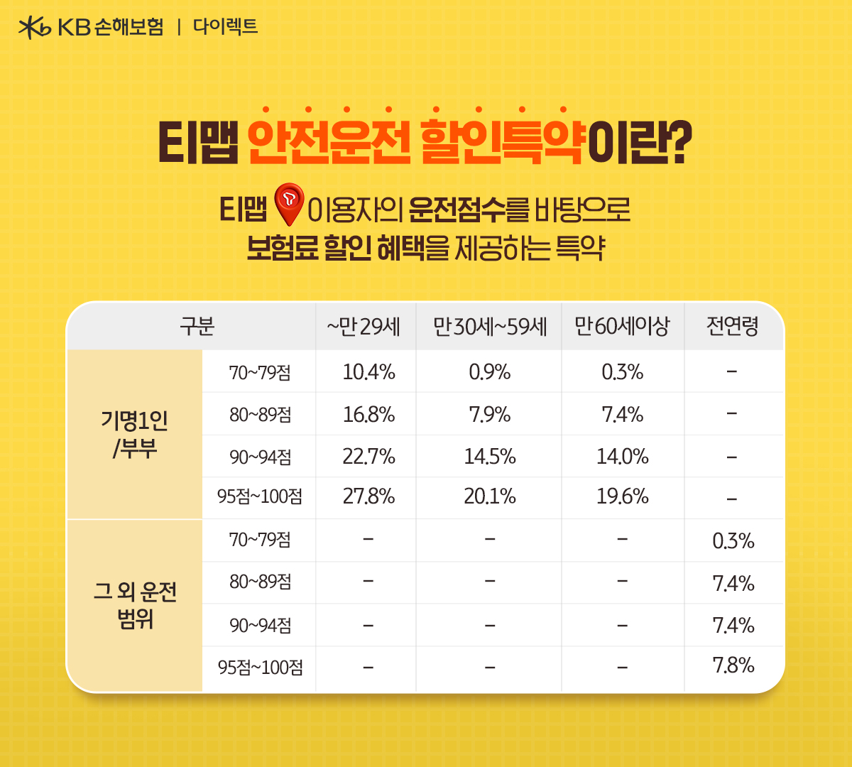 기존에 많은 분들이 이용하던 ‘티맵 안전운전 할인특약’ 역시 KB손해보험 다이렉트 자동차보험에서 운영 중이에요.