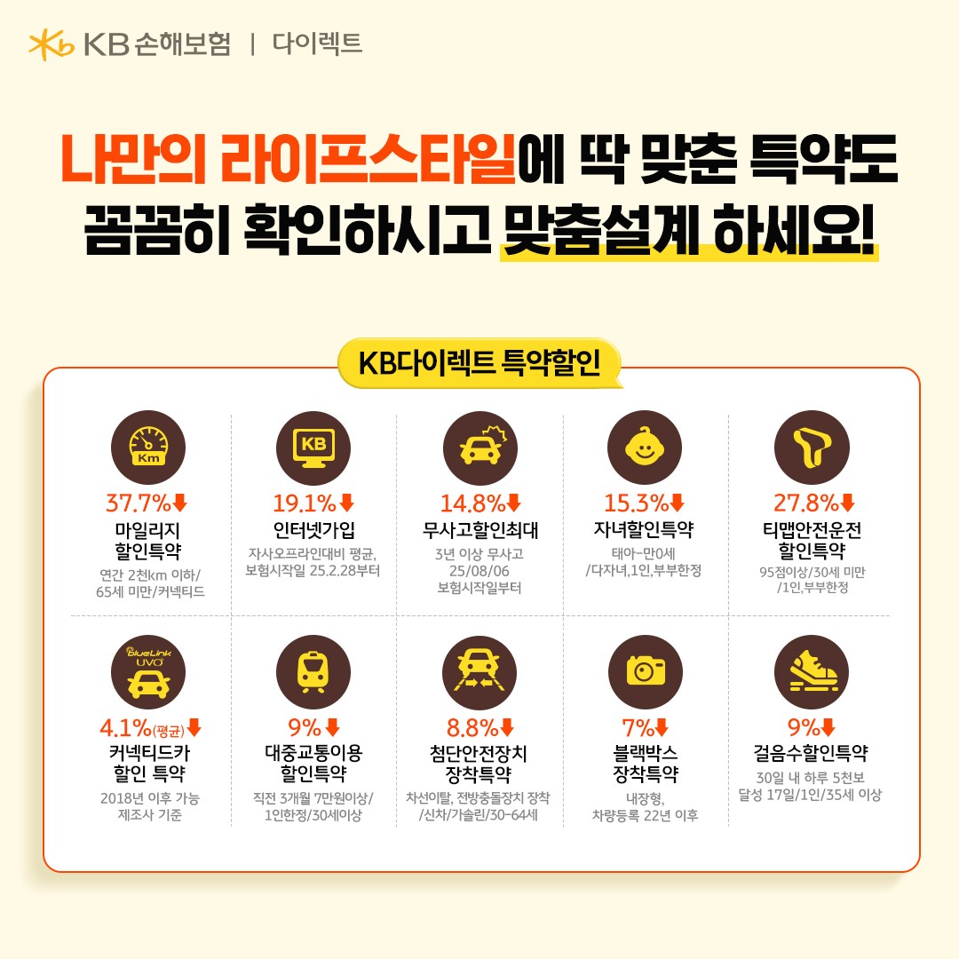 KB손해보험 다이렉트에는 이외에도 마일리지, 대중교통 할인특약 등 다양한 라이프스타일 맞춤 특약이 준비되어 있어요. 운전 습관과 생활 패턴에 따라 선택할 수 있는 다양한 할인 특약을 통해, 나만의 맞춤형 자동차보험 설계가 가능해요.