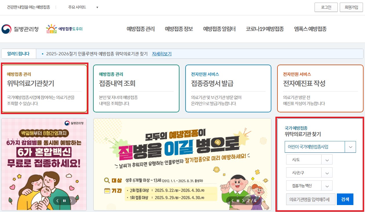 [질병관리청 예방접종도우미 홈페이지 메인화면]